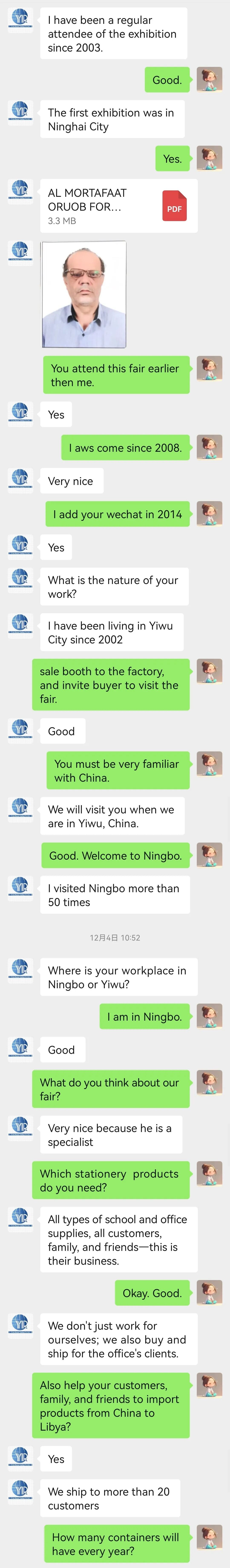 “I have been a regular attendee of the exhibition since 2004. We don't just work for ourselves,we also buy and ship for the office's clients. We ship to more than 20 customers.”(自2004年起,我便成为宁波文具展的常客。我不仅为自身业务采购,还为我的客户代购代运。目前我们为超过20家客户承运货物。)如今的Omar Abuzid,早已不是当年在市场摸索成长的创业者。他的公司在义乌站稳了脚跟,业务覆盖利比亚全境,不仅为当地学校、企业供应全品类学生文具与办公用品,还帮利比亚的亲戚朋友客户代购各类中国商品,每年从中国发往利比亚的集装箱高达100个左右。
