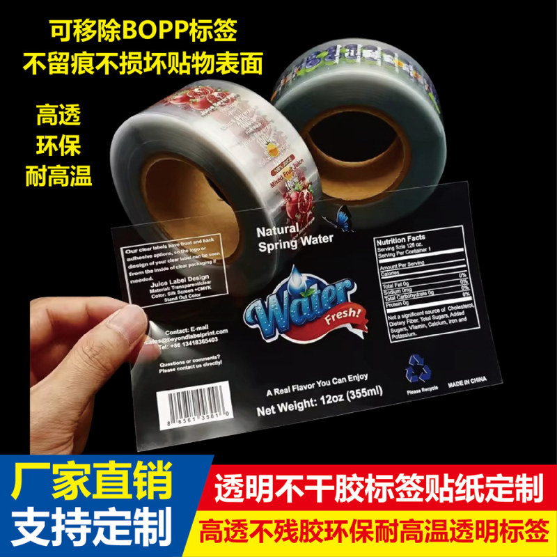 Transparent BOPP Sticker, Mineral Water Bottle Label, Transparent PET Adhesive Sticker, Non-Residual Adhesive Clear Sticker