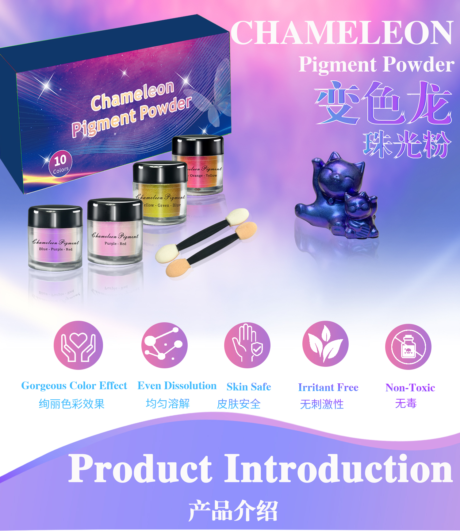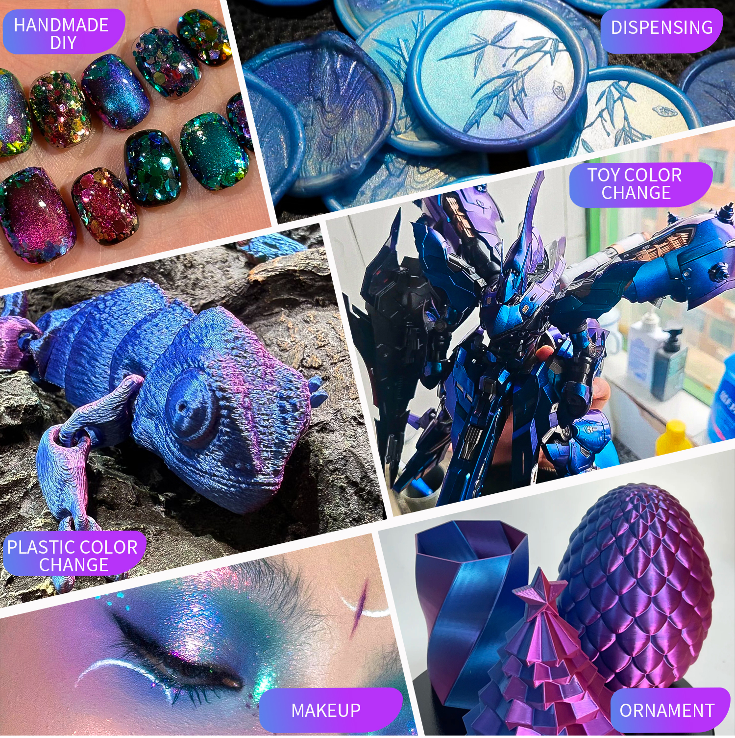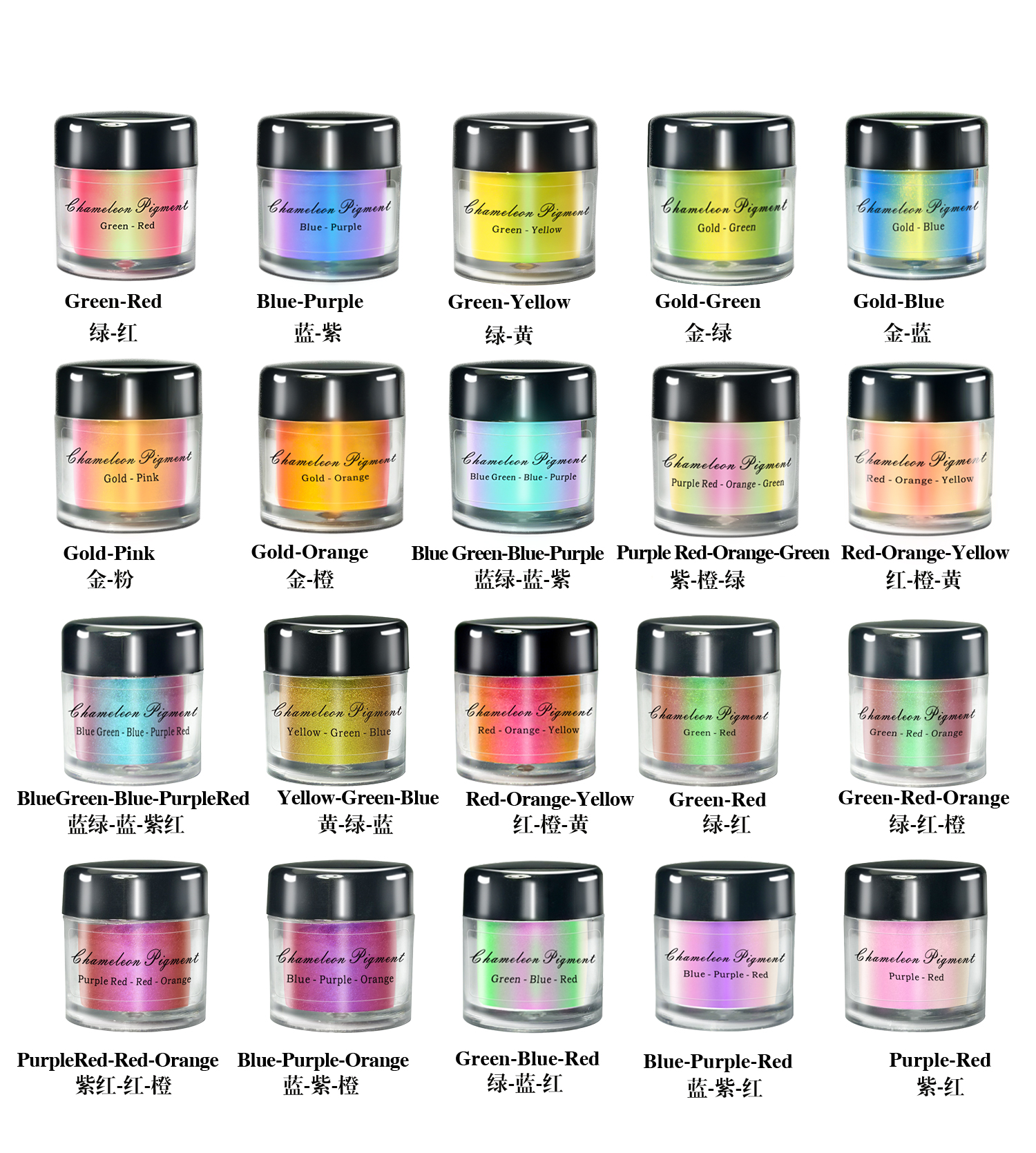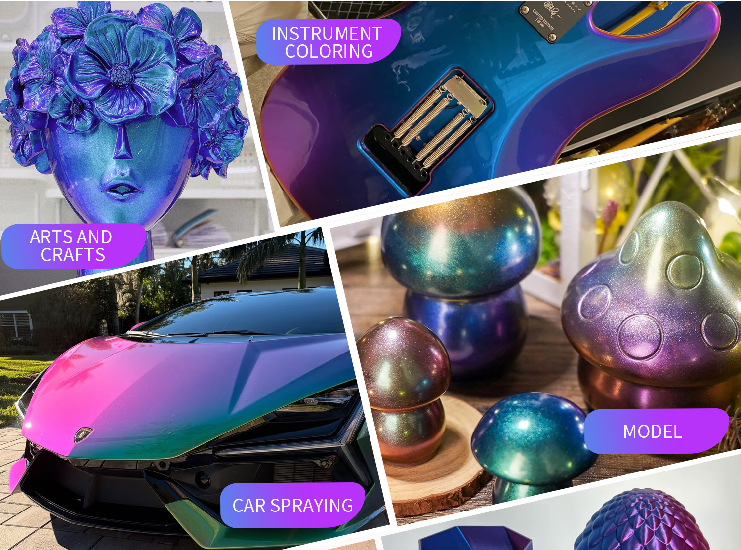 变色龙珠光粉具有独特的色彩变化效果。一般呈现两三种颜色,非常适合制作环氧树脂工艺品、DIY工艺品、手机壳、绘画、水彩颜料、蜡烛、肥皂、彩色粘土、贺卡等。Chameleon pearl powder features a unique color-shifting effect, typically displaying two or three colors. It is ideal for making epoxy resin crafts, DIY crafts, phone cases, paintings, watercolor paints, candles, soaps, colored clay, greeting cards, and more.