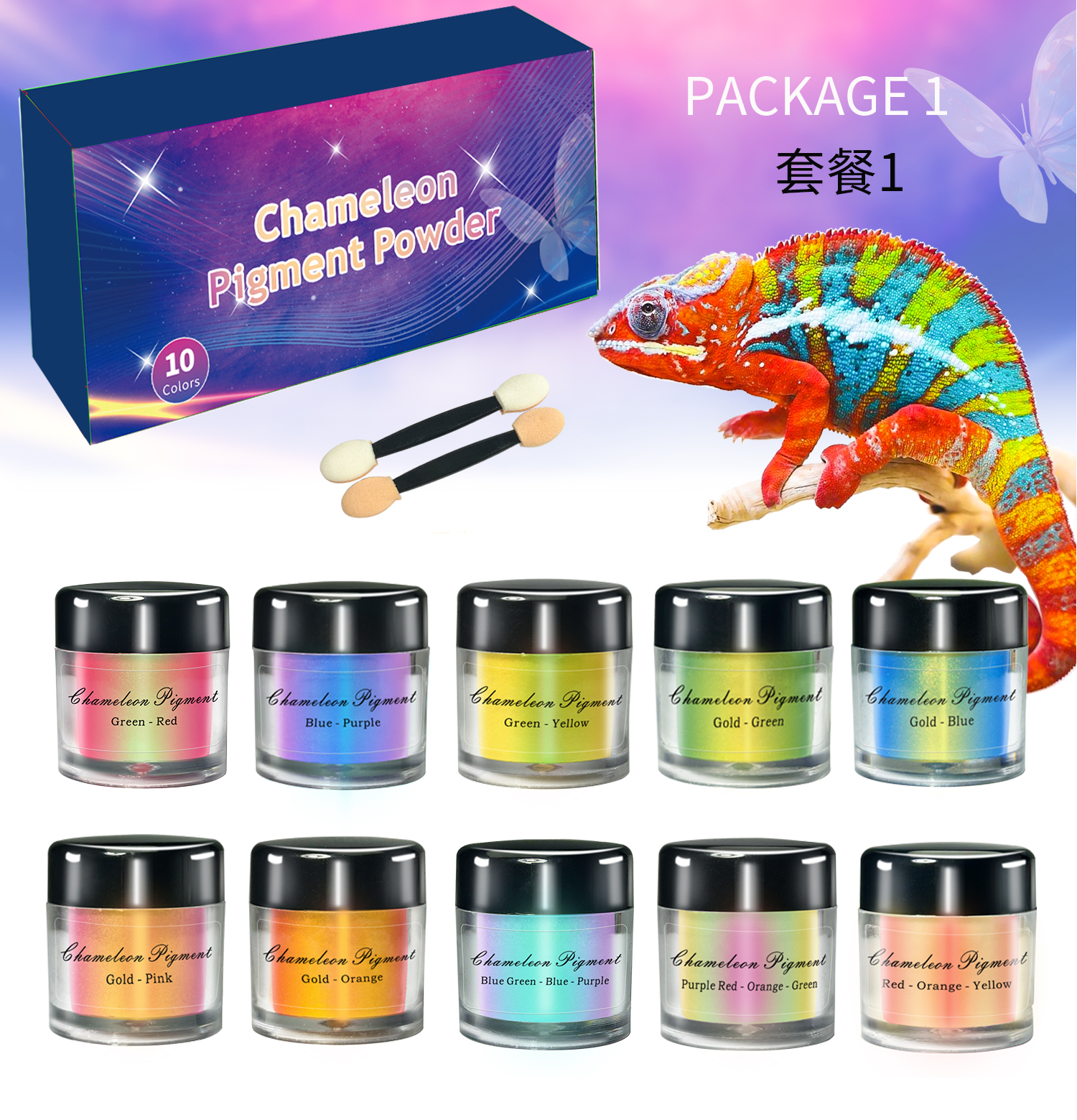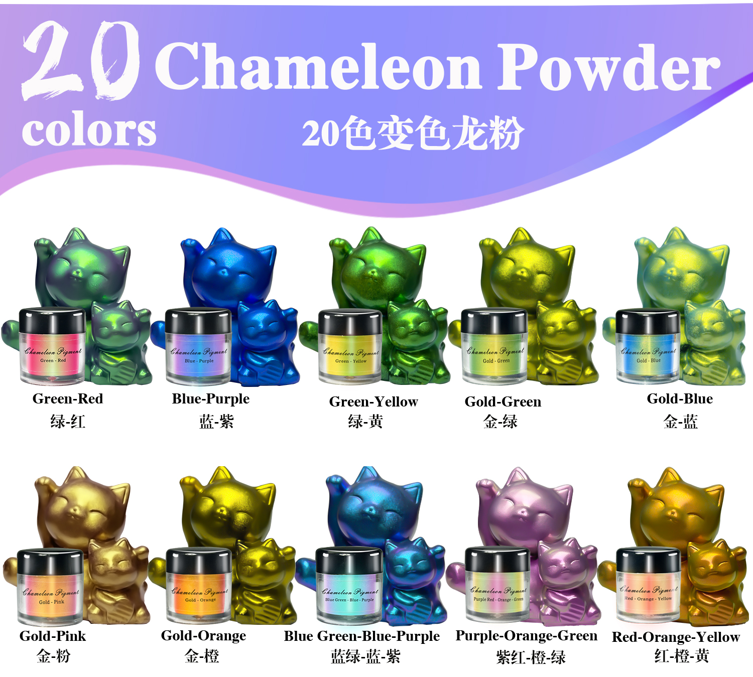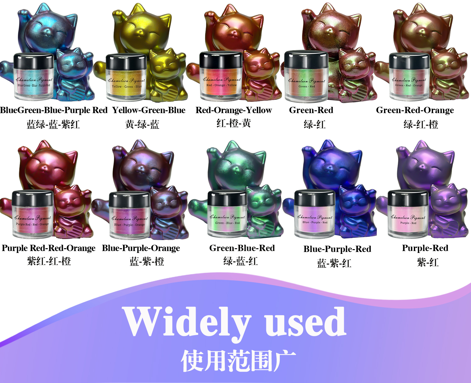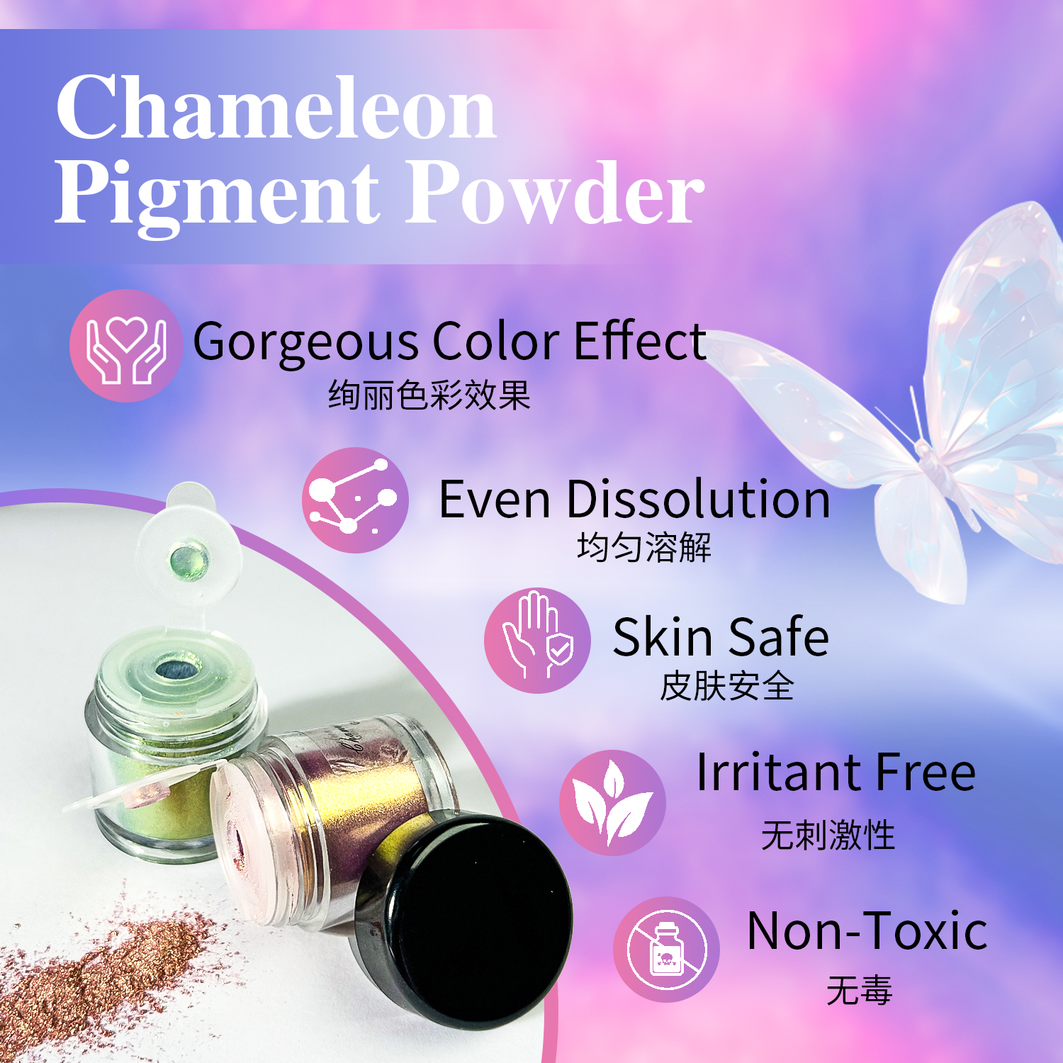 变色龙珠光粉具有独特的色彩变化效果。一般呈现两三种颜色,非常适合制作环氧树脂工艺品、DIY工艺品、手机壳、绘画、水彩颜料、蜡烛、肥皂、彩色粘土、贺卡等。Chameleon pearl powder features a unique color-shifting effect, typically displaying two or three colors. It is ideal for making epoxy resin crafts, DIY crafts, phone cases, paintings, watercolor paints, candles, soaps, colored clay, greeting cards, and more.