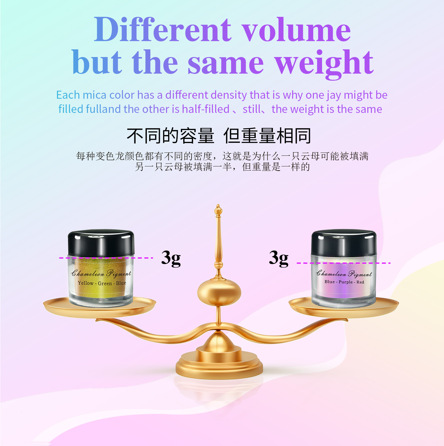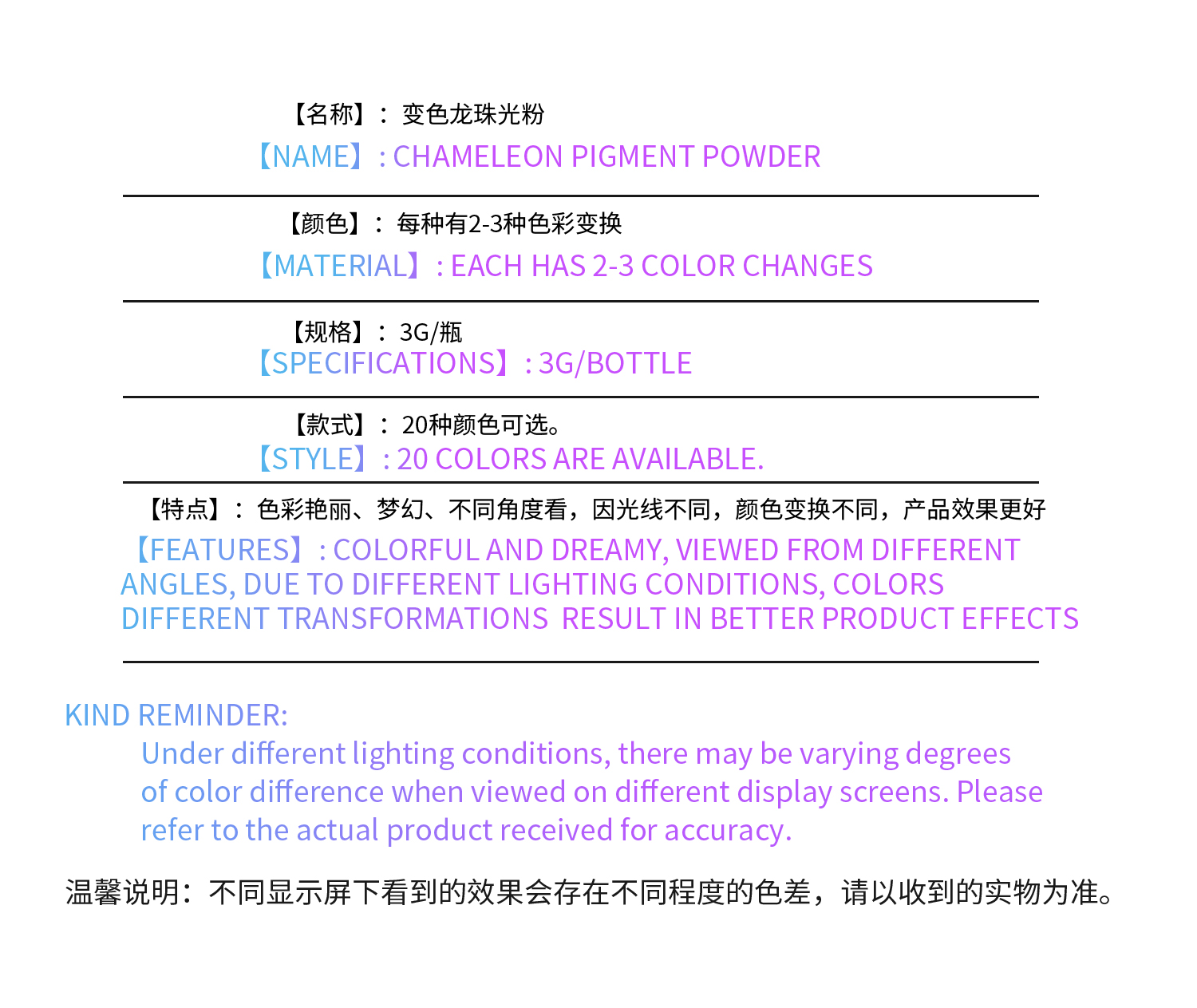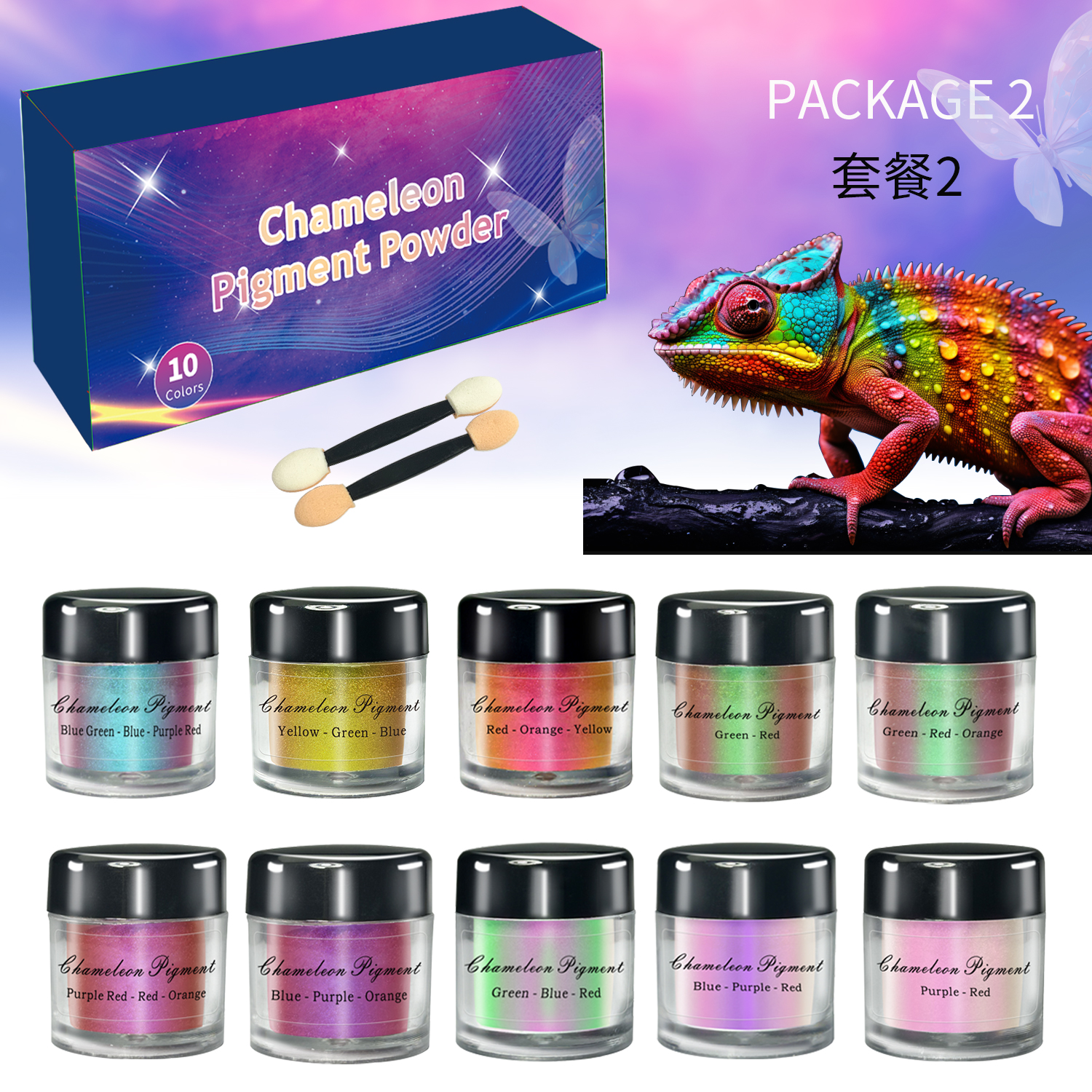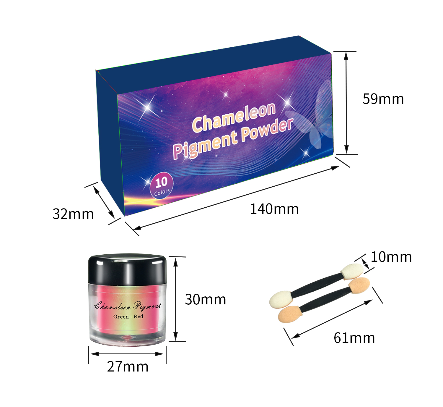 变色龙珠光粉具有独特的色彩变化效果。一般呈现两三种颜色,非常适合制作环氧树脂工艺品、DIY工艺品、手机壳、绘画、水彩颜料、蜡烛、肥皂、彩色粘土、贺卡等。Chameleon pearl powder features a unique color-shifting effect, typically displaying two or three colors. It is ideal for making epoxy resin crafts, DIY crafts, phone cases, paintings, watercolor paints, candles, soaps, colored clay, greeting cards, and more.