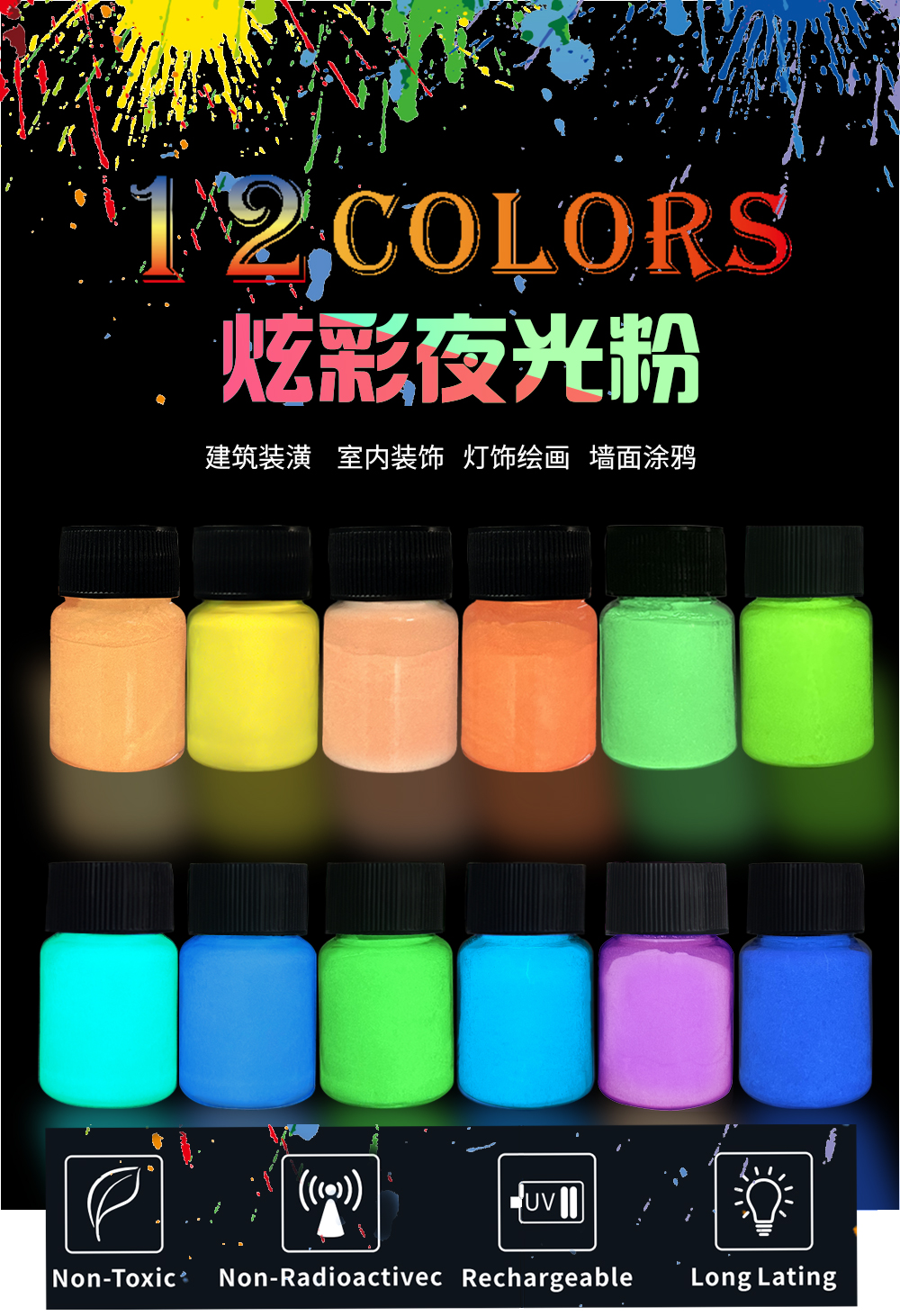 夜光颜料粉可以吸收普通光源并在黑暗中发光。可以搭配水彩颜料、DIY工艺品、环氧树脂、绘画、蜡烛等用途      Luminous pigment powder can absorb ordinary light sources and glow in the dark. It can be used with watercolor paints, DIY crafts, epoxy resins, paintings, candles, and other applications.