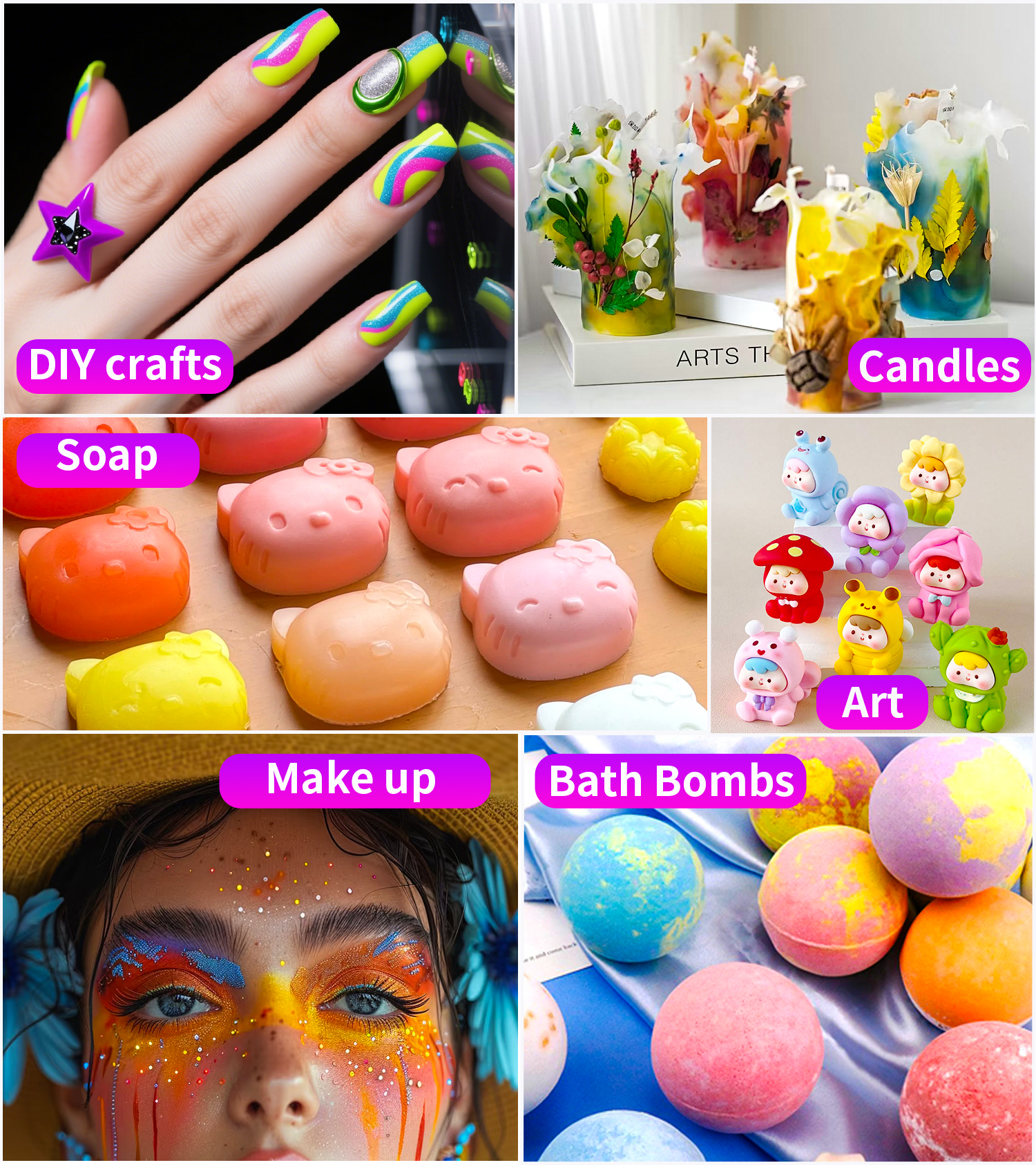 Thisneon pigment powder setincludes 12 bright,vivid shades.guaranteeingthatrich,vibrant hues will stand out in any project.